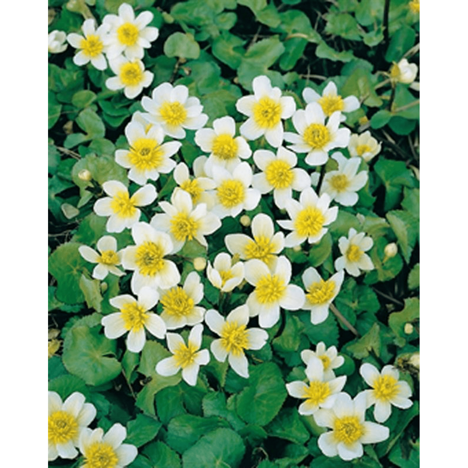 Caltha palustris 'Alba' is een witte variëteit van de moerasbloem of gele waterroos (Caltha palustris), een opvallende vijverplant uit de familie Ranunculaceae. Deze plant is afkomstig uit vochtige gebieden zoals moerassen, rivieroevers en ondiepe vijvers in Europa, Azië en Noord-Amerika. Net als de traditionele gele variant, is de witte Caltha palustris geliefd vanwege zijn elegante uitstraling en vroege bloei.