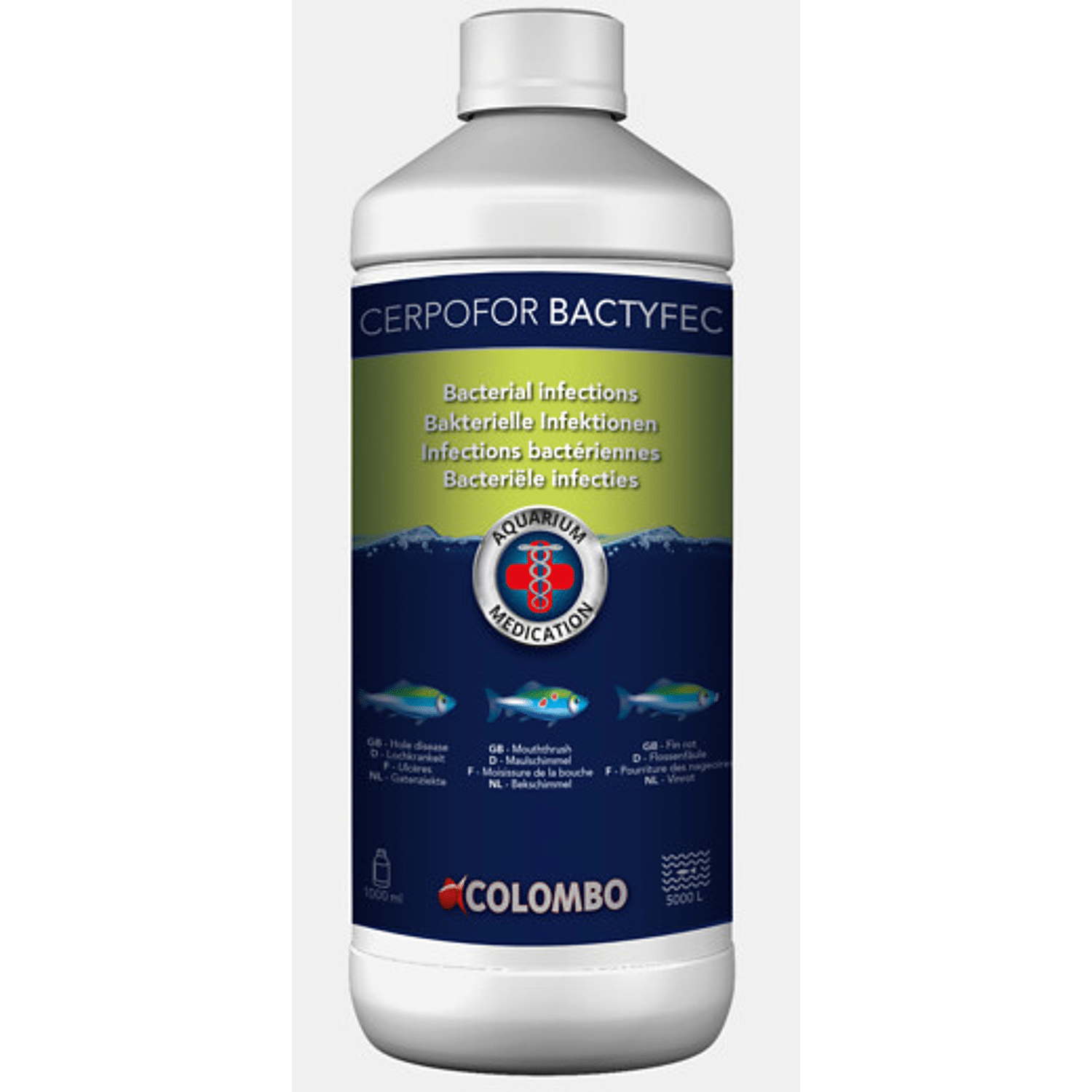 Colombo Bactyfec is werkzaam tegen bacteriële infecties, zoals vinrot, gatenziekte (huidzweren), bekschimmel en andere ziekteverschijnselen die worden veroorzaakt door bacteriële infecties. Effectieve werking tegen bacteriële problemen Op basis van 40 jaar ervaring en onderzoek biedt Colombo de meest effectieve remedies voor de behandeling van visziektes. Dosering: 2 ml per 10 liter water, 1000 ml is voldoende voor 5000 liter.