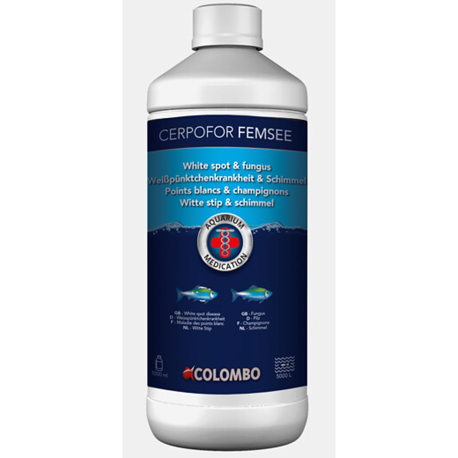 Colombo Femsee is werkzaam tegen schimmel en witte stip. Witte Stip is te herkennen aan kleine witte stippen op kop en lichaam. Schimmel ziet eruit als witte tot groene watachtige plukken. Effectieve werking tegen witte stip en schimmels. Op basis van 40 jaar ervaring en onderzoek biedt Colombo de meest effectieve remedies voor de behandeling van visziektes. Dosering: 2 ml per 10 liter water, 1000 ml is voldoende voor 5000 liter.