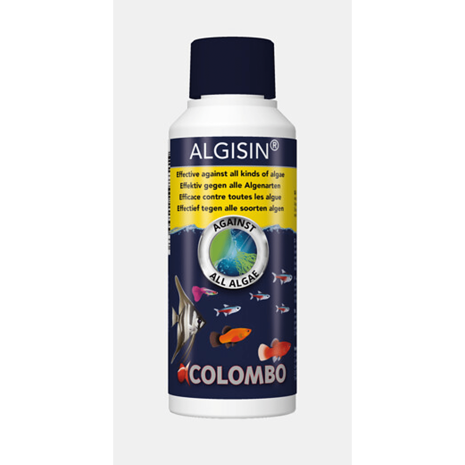 Algisin is effectief tegen alle soorten algen in zoetwateraquria. Door onder andere de voedingsstof opname te verlagen, kunnen algen niet meer groeien en gaan uiteindelijk dood. Aquariumplanten kunnen hun voedingsstoffen opnemen via de aquariumbodem en worden zo ontzien. Colombo Algisin bestrijd algen en zorgt voor een glashelder aquarium! Algisin is effectief tegen alle soorten algen en bevat geen koper. Dosering: 1 ml per 20 liter water, met 250 ml kan 2500 liter 2x worden behandeld. Test altijd eerst het aquariumwater en corrigeer indien nodig voor u een algenmiddel toevoegt!