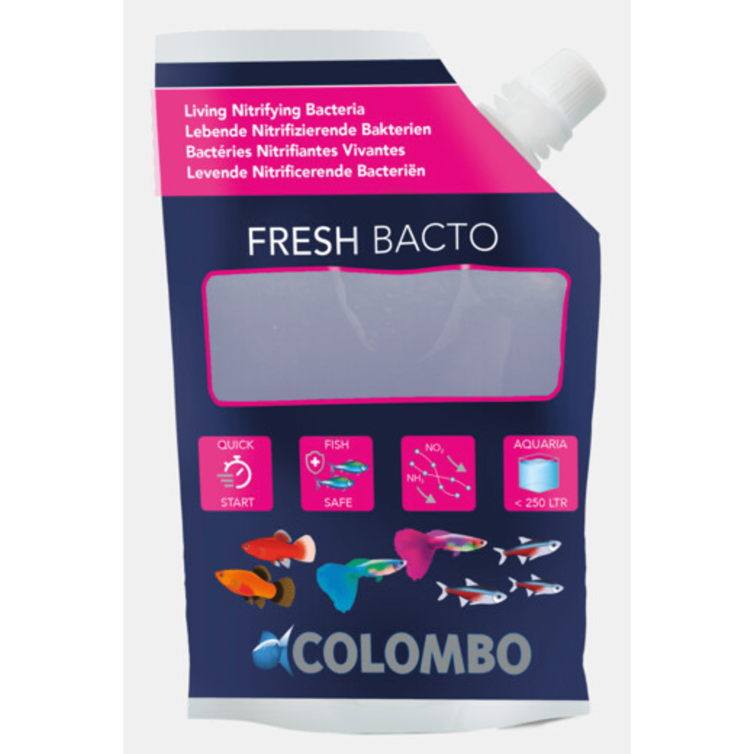 Gelijk vissen in het nieuwe aquarium? Normaal moet je minimaal 1 week wachten voor er enkele vissen in het aquarium kunnen worden geplaatst, met Colombo Fresh Bacto start jouw aquarium razendsnel op, de levende nitrificerende bacteriën gaan direct aan het werk en voorkomen problemen met ammoniak en nitriet. Bewaren in de koelkast <6°C, goed schudden, geschikt voor zoetwater en zeewater. Gebruik Colombo Fresh Bacto ook na een grote schoonmaak van het aquarium of de filter of na behandling met medicijnen, zo voorkom je waterproblemen. 250 ml is geschikt voor 250 liter aquariumwater, overdosering kan geen kwaad, meer bacterien betekent een snellere werking.
