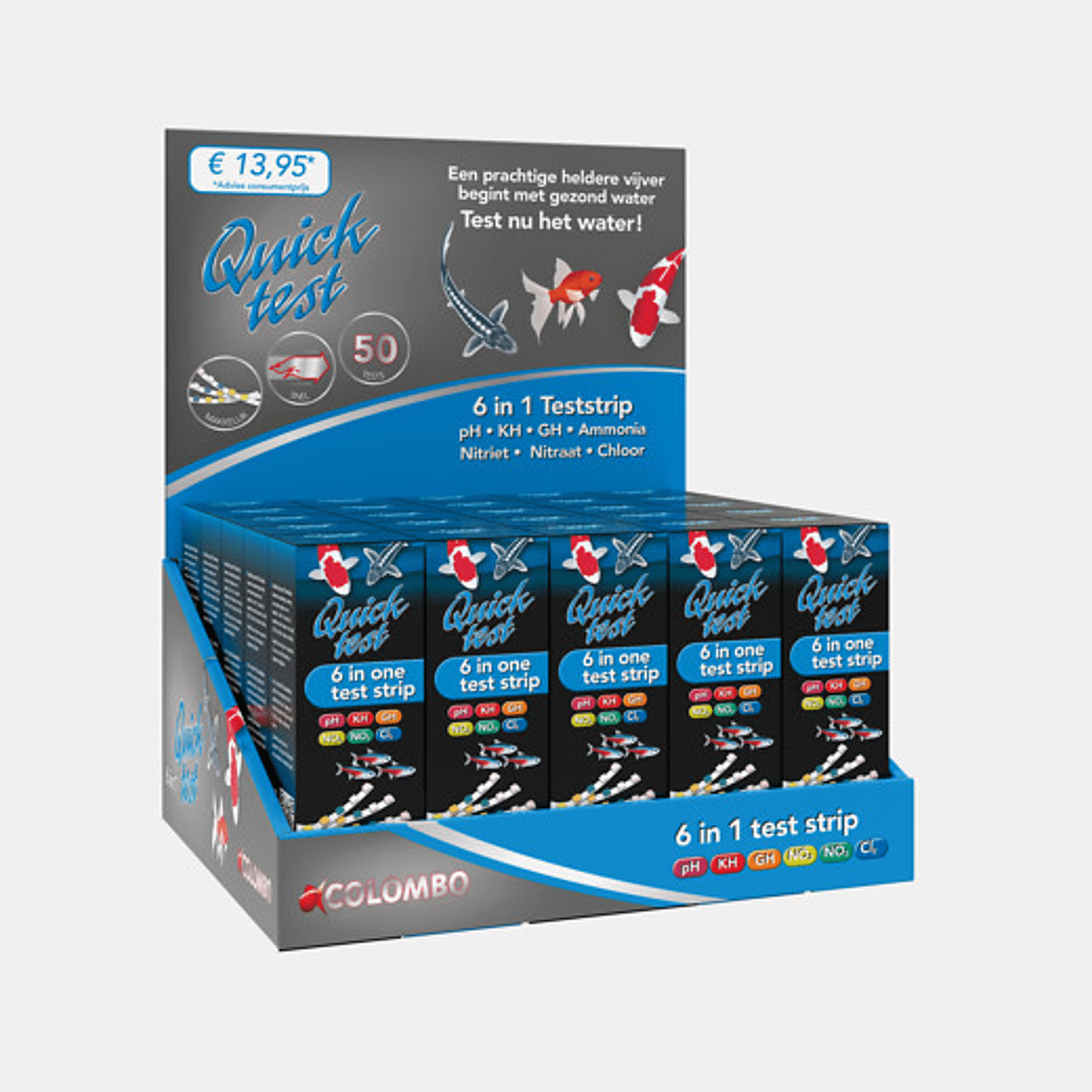 Toonbank display met kopkaart in 4 talen (NL-FR-DU-EN), inhoud 25 verpakkingen Colombo Quicktest