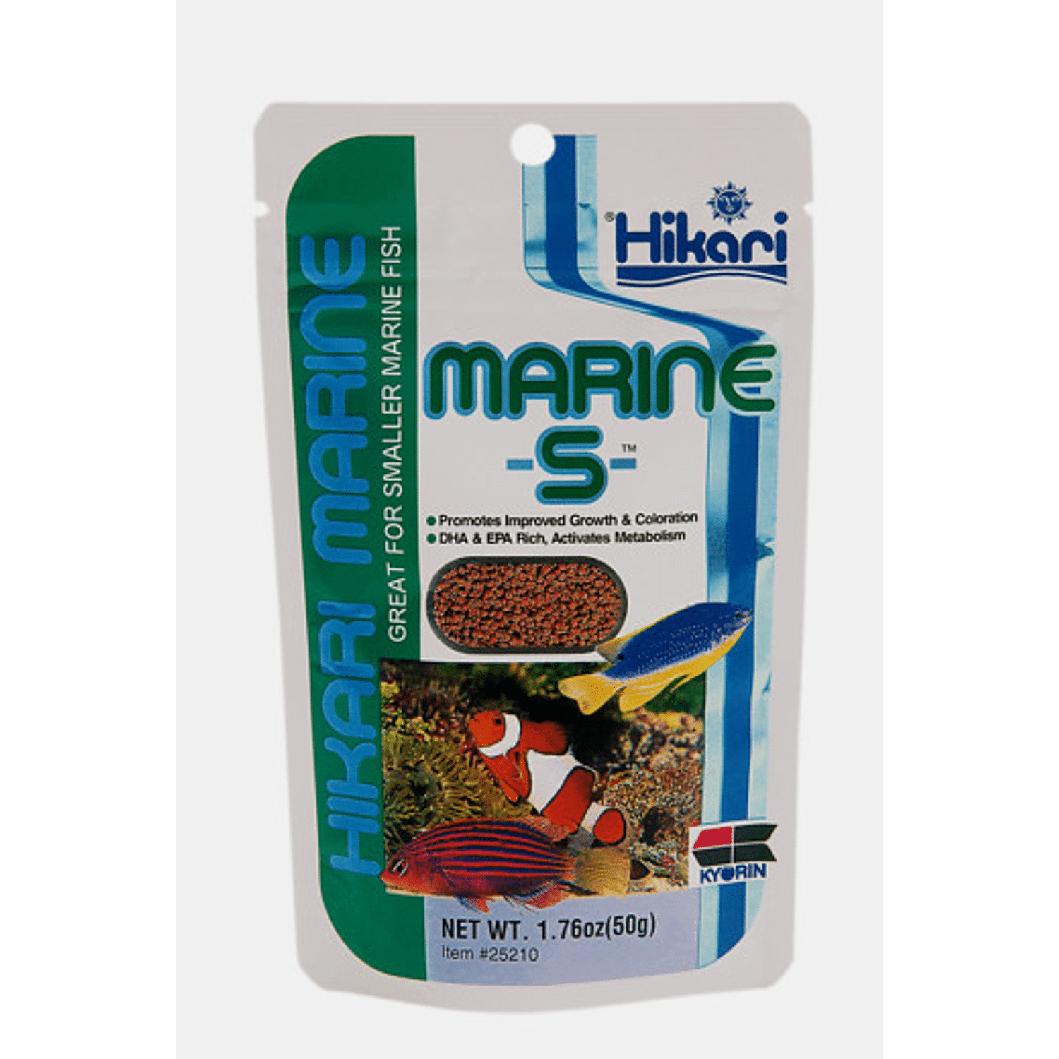 Hikari Marine S is ontwikkeld voor kleinere omnivore en carnivore zeewatervissen. Het voer heeft een bijzonder hoog eiwitgehalte, precies wat de vissen van het rif nodig hebben en door de toevoeging van chitosan is het voer gemakkelijk verteerbaar. Dagelijks voer voor kleinere zeewatervissen, de langzaam zinkende sponsachtige korrel wordt gemakkelijk gegeten. Bevat een hoog eiwitgehalte voor gezonde groei en garnalen poeder en zuiver gekweekte spirulina voor fantastische kleuren. Voer 2 tot 3 x daags zoveel als de vissen opeten, verwijder overgebleven voer.