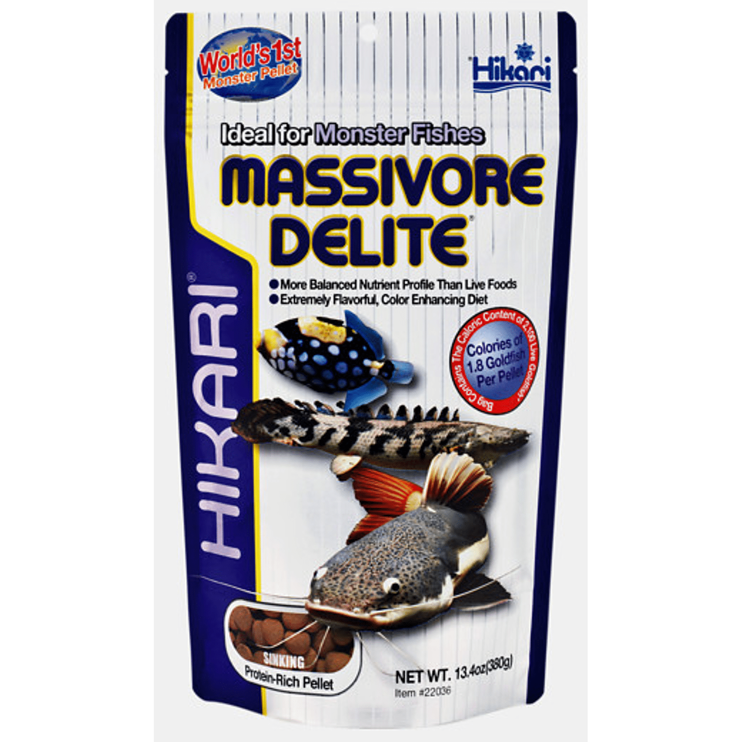Hikari Massivore Delite is een zeer voedzame en eiwitrijke korrel voor roggen, meervallen en vleesetende Plecostomus. De meeste grote roofvissen leven in een UV-rijke omgeving. Met behulp van biotechnologie en kleurversterkende ingrediënten in Hikari Massivore Delite, kunnen vissen levendige kleuren ontwikkelen ondanks het gebrek aan natuurlijk zonlicht. Zinkende sponsachtige korrel, zeer voedzaam, één XL-korrel bevat evenveel calorieën als twee goudvissen. Ideaal voor bodembewonende vleeseters zoals roggen en meervallen. Voer zoveel als de vissen binnen 1 uur opeten, nooit overvoeren, verwijder overtollig voer.