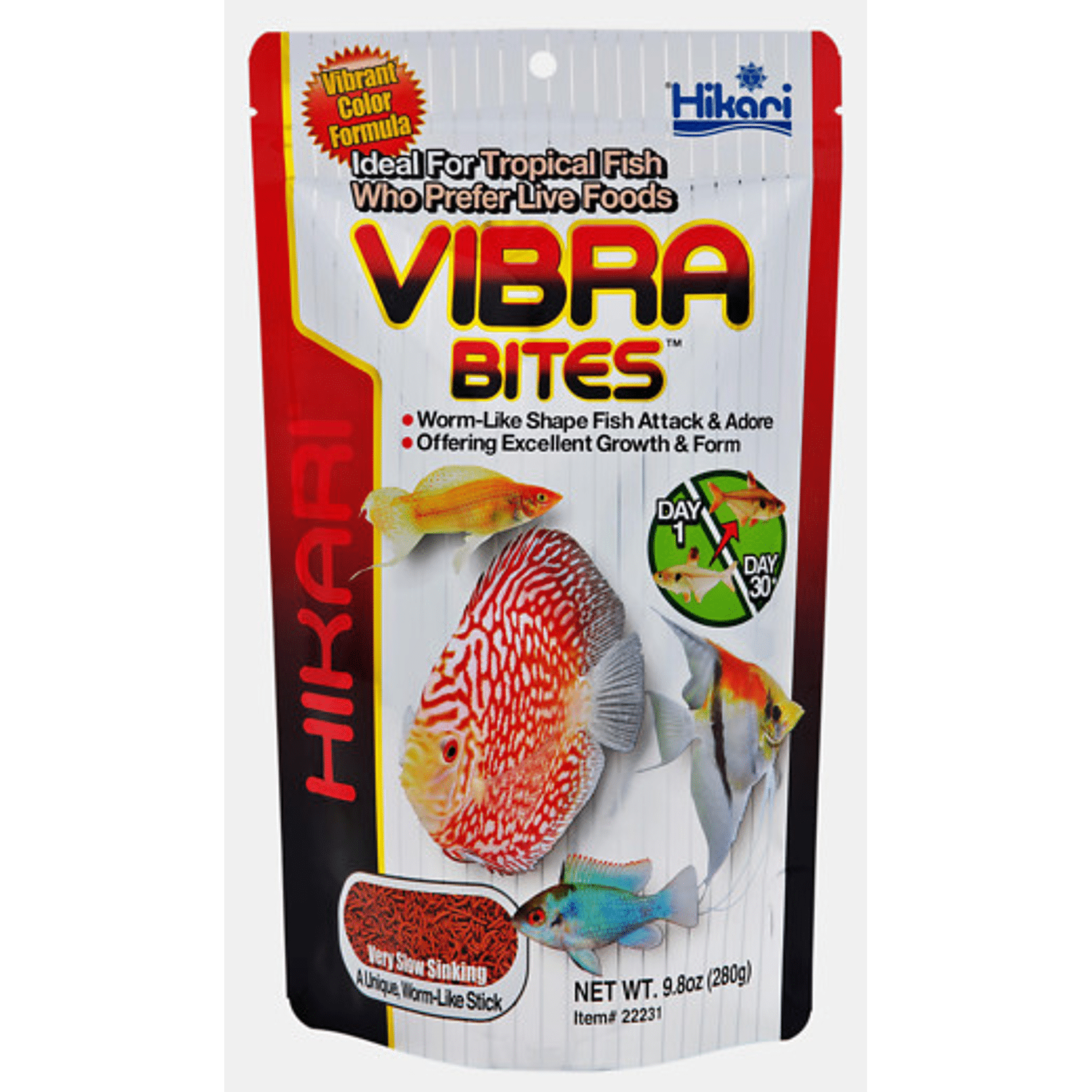Hikari Vibra Bites is ontworpen om de vorm en beweging van levende rode muggenlarven na te bootsen. Het voer zinkt langzaam en beweegt door de stroming in het water zoals levend voer, dit lokt de vissen om te eten, de meeste vissen zijn gek op dit soort voer. Hikari Vibra Bites zorgt voor uitzonderlijke, briljante en levendige kleuren. Het voer kan gevoerd worden aan alle vissen die ook levend voer eten. Dagelijks voer voor alle soorten vis welke ook rode muggenlarven eten, perfect alternatief voor levend voer, door de vorm beweegt het voer als een levende worm Door de wetenschappelijke en bijzonder voedzame samenstelling zijn de groei en kleurverbetering van de vissen al binnen één maand zichtbaar. Voer 2 x daags zoveel als de vissen binnen 5 minuten opeten, verwijder overgebleven voer