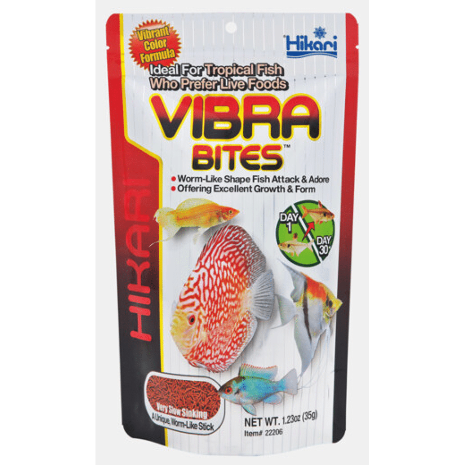 Hikari Vibra Bites is ontworpen om de vorm en beweging van levende rode muggenlarven na te bootsen. Het voer zinkt langzaam en beweegt door de stroming in het water zoals levend voer, dit lokt de vissen om te eten, de meeste vissen zijn gek op dit soort voer. Hikari Vibra Bites zorgt voor uitzonderlijke, briljante en levendige kleuren. Het voer kan gevoerd worden aan alle vissen die ook levend voer eten. Dagelijks voer voor alle soorten vis welke ook rode muggenlarven eten, perfect alternatief voor levend voer, door de vorm beweegt het voer als een levende worm Door de wetenschappelijke en bijzonder voedzame samenstelling zijn de groei en kleurverbetering van de vissen al binnen één maand zichtbaar. Voer 2 x daags zoveel als de vissen binnen 5 minuten opeten, verwijder overgebleven voer