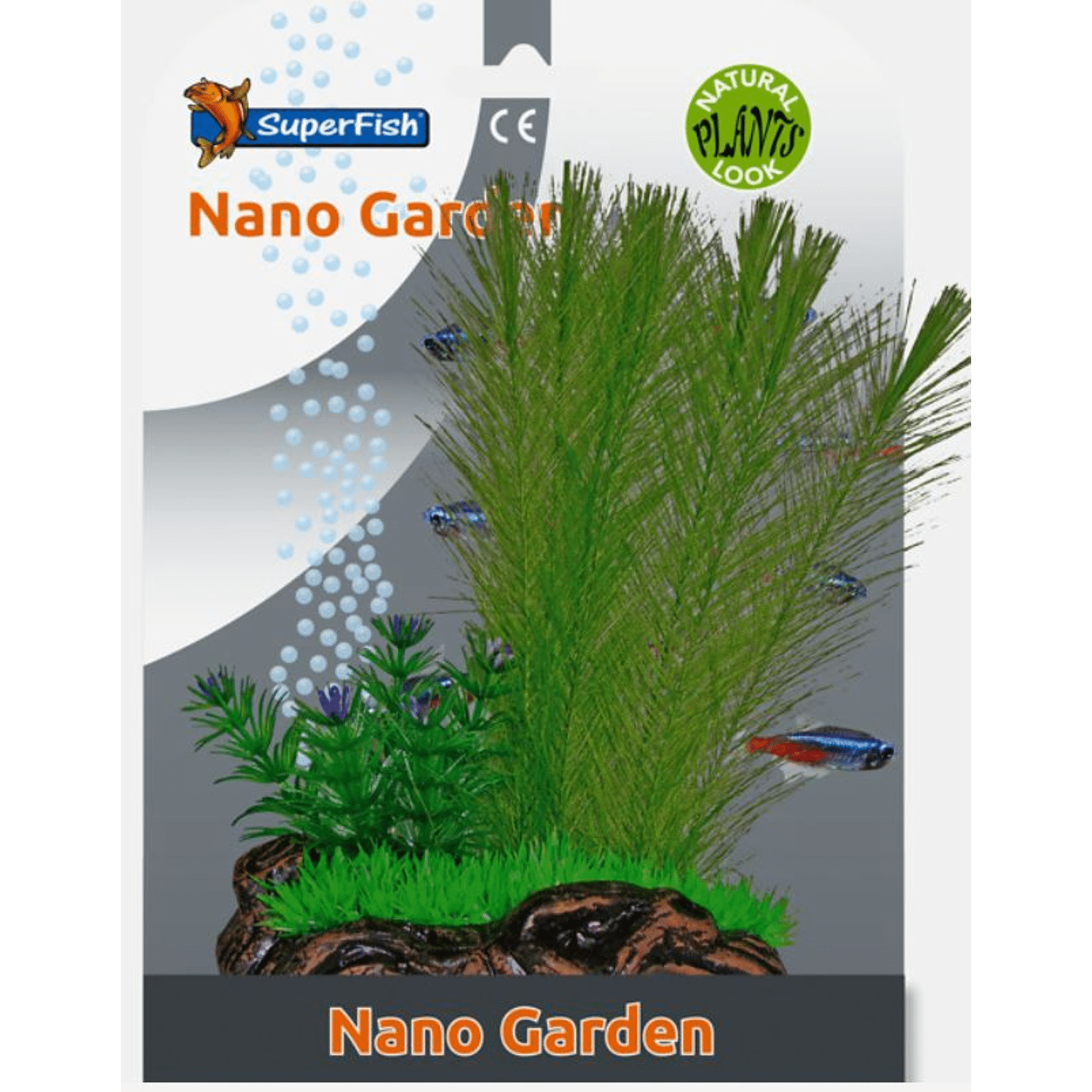 Klein kunstmatig tuintje met 3 soorten planten op drijfhout. De Nano Wood Garden heeft een slangaansluiting en luchtsteen voor een luchtpomp. Realistic looking small artificial gardens each of which include 3 plants on a driftwood base. Nano Wood Gardens create hiding place for fish and include a built-in air connector and air stone.