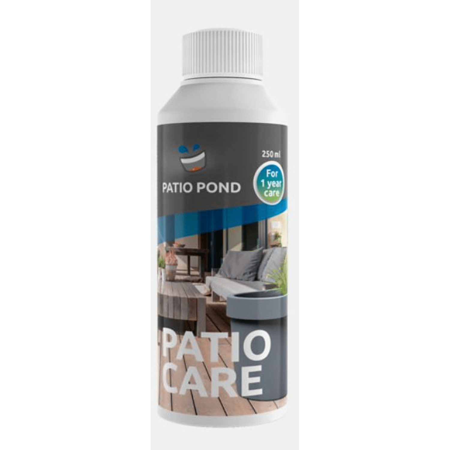 Patio Care bevat mineralen die vissen en planten nodig hebben, de toegevoegde bacteriën zorgen voor een optimale biologie en zorgen voor helder water! Bevat uitsluitend natuurlijke ingrediënten, huisdieren en vogels kunnen zonder enig bezwaar uit de Patio Pond drinken wanneer Patio Care wordt toegepast. Het water kan na toedienen eerst wit verkleuren, het water is binnen 24 uur weer helder.Dosering: Wekelijks 1 dop (10 ml) over de Patio Pond verdelen. Onderhoudsproduct voor schoon en helder water in de Patio Pond.