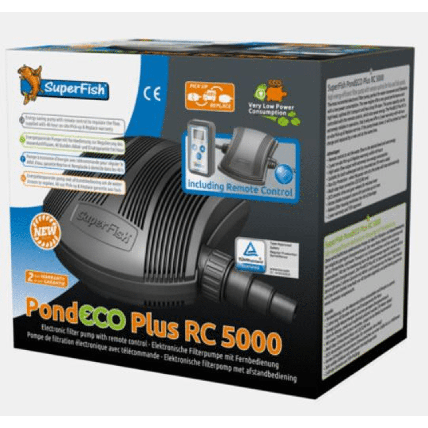 De PondECO Plus E is ook verkrijgbaar met een afstandsbediening, waarmee u de pompcapaciteit kunt regelen. Met de afstandsbediening kunt u de pomp in- en uitschakelen en de waterflow en op het gewenst niveau (10 stappen) instellen en daarmee energie besparen. Verkrijgbaar in vijf uitvoeringen: PondECO Plus RC 5000, 10000, 15000, 20000 en 26000. Inclusief 2 jaar Pick-up and Replace garantie voor maximale zekerheid en zorgeloos gebruik. Voorzien van afstandsbediening, waarmee de pompcapaciteit en opvoerhoogte in te stellen is. Zeer solide behuizing zorgt voor een minimale kans op verstopping en maakt installatie en onderhoud eenvoudig. De elektronische motor zorgt voor zeer goede prestaties bij een extreem laag energieverbruik. Kan in droogopstelling en als onderwaterpomp worden gebruikt. Multi-step slangaansluiting. 2 jaar garantie en TÜV keuring. Dubbele keramische ophanging Droogloop beveiliging