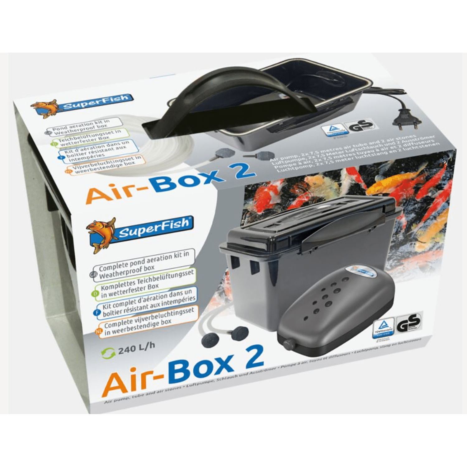 Complete beluchtingssets in een handige box, beschermt tegen regen- en spatwater. Zorgt voor verse zuurstof in het vijverwater. Houdt uw vijver gezond in de zomer en ijsvrij in de winter. Compleet met luchtslang en 1, 2 of 4 luchtstenen. Extra reserve membraan meegeleverd. Complete set geleverd met 2 x 7,5 meter luchtslang en 2 luchtstenen (ø 20 mm). Zorgt voor voldoende zuurstof in de vijver tijdens de warme maanden, en helpt de vijver ijsvrij te houden in de winter. Luchtpomp 240 L/h, verbruik 4W, 2 jaar garantie.