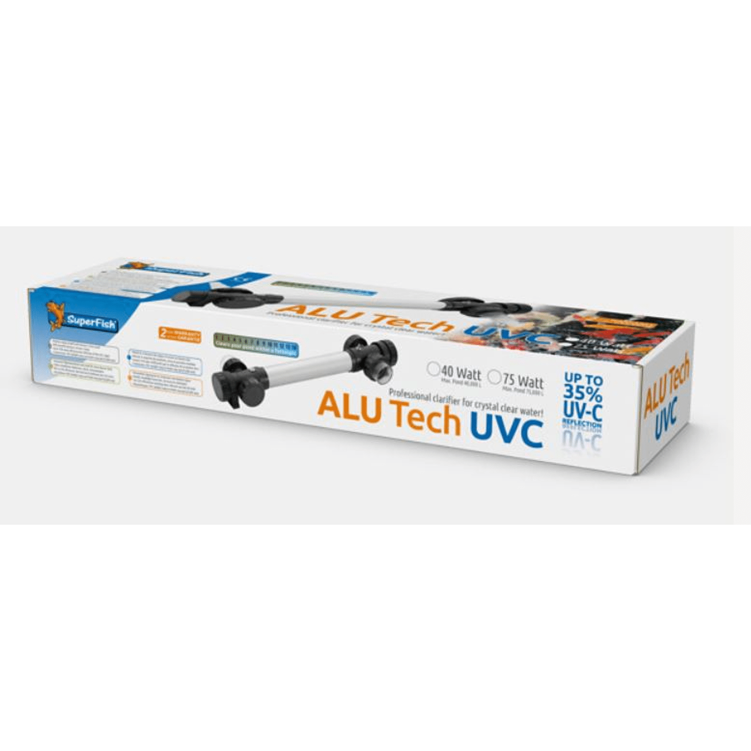 Aluminium UVC geschikt voor grote combi-vijvers. Verkrijgbaar in 2 uitvoeringen nl. ALU Tech UVC 40 Watt voor vijvers tot 40.000 liter en 75 Watt voor vijvers tot maar liefst 75.000 liter. Kan zowel gelijmd (PVC Ø 50/63 mm) als met slang (Ø 40/32/25 mm) aangesloten worden. Aluminium huis, reflecteert ultraviolette straling voor een betere werking. Gemakkelijk te installeren door Double Head ingang- en Triple Head uitgang-aansluiting. T5 High Output UV-lamp voor optimale reinigingskracht. Gegarandeerd 8000 branduren. Het aluminium huis is oersterk en reflecteert ultraviolette straling voor een betere werking, de T5 High Output UV-lamp garandeert optimale reinigingskracht en heeft minimaal 8000 branduren. Gemakkelijk te installeren door Double Head ingang- en Triple Head uitgang-aansluiting, kan zowel gelijmd met PVC (Ø 50/63 mm) als met slang (Ø 40/32/25 mm) worden aangesloten. UVC 4W, maximale vijverinhoud 40.000 liter, 2 jaar garantie.