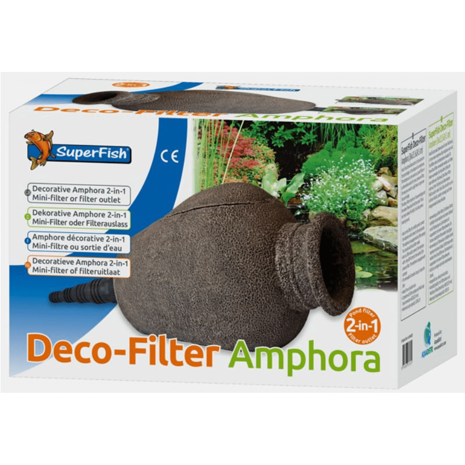 Decoratieve waterornamenten voor op de vijverrand, in de vorm van een Amphora, Karper en Kikker. Op twee manieren te gebruiken: Sluit het met een slang (Ø 40 mm) aan op de uitlaat van een drukfilter en er hangt geen lelijke slang meer over de vijverrand. Of als mini-filter voor kleinere vijvers, vul het met filtermedia en sluit een pomp aan en het werkt als een eenvoudig biologisch filter. Door de afneembare deksel is het filter eenvoudig te reinigen. Vervaardigd uit een duurzaam kunsthars, compleet geleverd met filterspons en Multi-step slangaansluiting (Ø 40/32/25 mm). Gebruik, sluit een vijverpomp met slang aan op de Multi-step slangaansluiting (slangdiameter Ø40/32/25 mm) of sluit de decoratie met vijverslag aan op de uitlaat van een drukfilter. De decoratie werkt ook als een eenvoudig biologisch filter, U kunt extra media aan de filterkamer toevoegen, door de afneembare deksel is het filterschuim eenvoudig te reinigen. Afmeting 36X32,5X24,5CM, compleet geleverd met filterspons en Multi-step slangaansluiting.