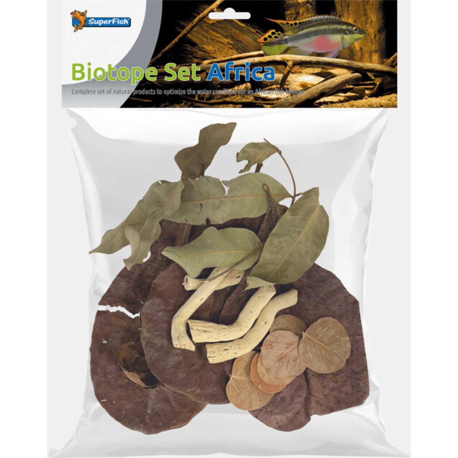 Complete set natuurlijke producten om de watercondities voor een Afrikaanse visbiotoop te optimaliseren De set bevat catappa-, groene en rode longanbladeren, dit zijn natuurlijke gezondheidsstimulatoren en waterconditioners. De set bevat ook decoratieve items zoals gedroogde cederrozen, klein drijfhout, kleine spiderwood takjes en kokosnootbloemen. Gebruik; Voorzichtig spoelen met kraanwater, toevoegen aan je aquarium. Deze natuurlijke producten kunnen het aquariumwater kleuren, dit betekent dat ze werken en dat het goed is voor je vissen. Sommige delen blijven aanvankelijk drijven, deze zullen na 3 tot 4 dagen zinken. Je kunt de hoeveelheid producten aanpassen aan de grootte van je aquarium of de gewenste kleur.