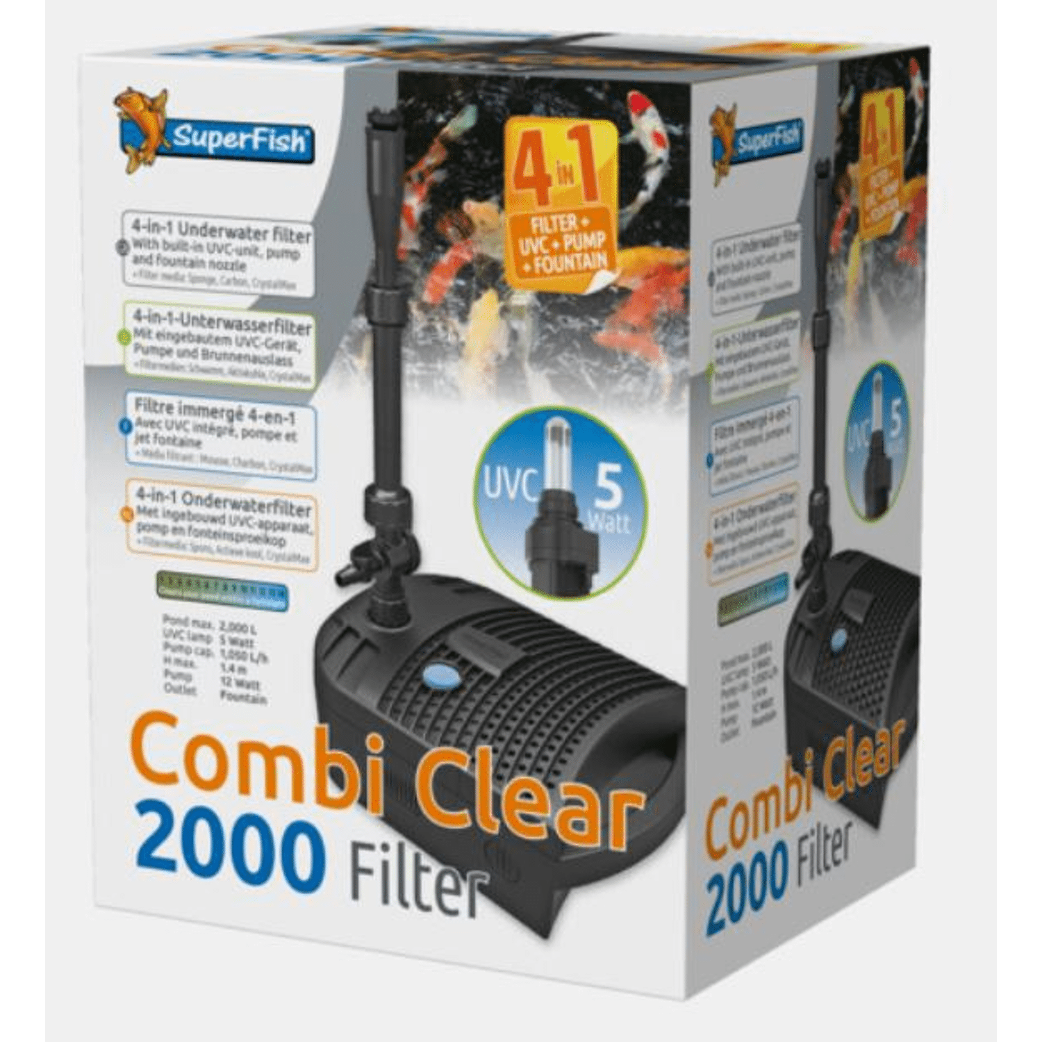 Eenvoudig en snel in gebruik te nemen, geen ingewikkelde installatie met slangen, kabels en allerlei aansluitingen. Plaats de Combi Clear op de bodem van de vijver, steek de stekker in het stopcontact en het filter werkt! Regelbare waterflow en opvoerhoogte met extra aansluiting voor een waterval. Energiezuinig, dus voordelig in gebruik. Inclusief 10 meter kabel en 2 jaar garantie. Filterkamer met actieve kool, CrystalMax en spons voor optimale filtratie en eenvoudig onderhoud. De stabiele basis en het grote handvat, maakt plaatsing in de vijver eenvoudig. Ingebouwde UVC, zorgt ervoor dat uw vijver binnen 14 dagen glashelder is. De Combi Clear wordt geleverd met filtermedia. Compact vijverfilter met ingebouwde UVC, deze zorgt ervoor dat uw vijver binnen 14 dagen glashelder is, de waterflow en opvoerhoogte zijn regelbaar, en er is een extra aansluiting voor een waterval. De stabiele basis en het grote handvat, maakt plaatsing in de vijver eenvoudig. De Combi Clear wordt geleverd met actieve kool, CrystalMax en een spons voor optimale filtratie en eenvoudig onderhoud. Vervangingsmedia sets zijn verkrijgbaar bij uw dealer. Geschikt voor vijvers tot 2.000 liter inhoud, energiezuinig, voordelig in gebruik, Inclusief 10 meter kabel en 2 jaar garantie.