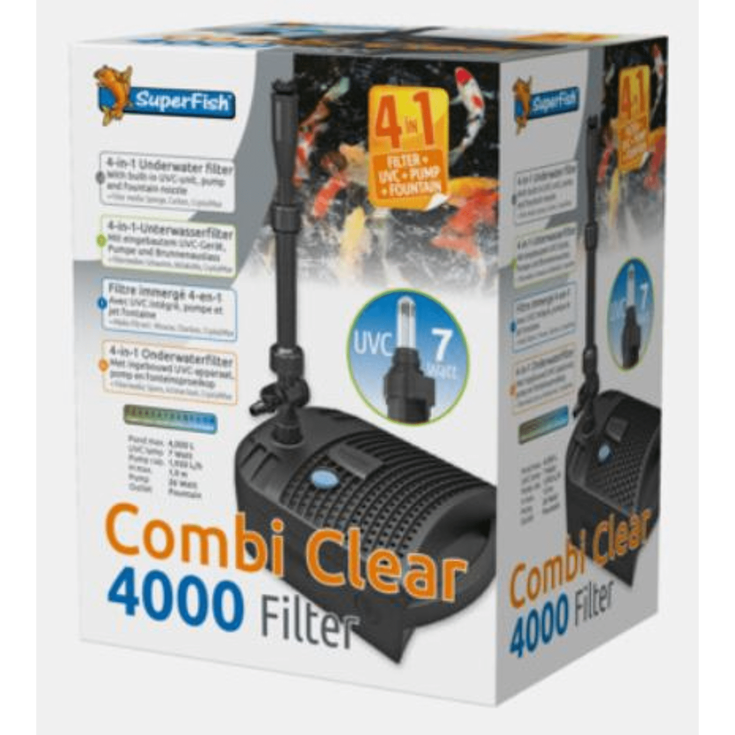Eenvoudig en snel in gebruik te nemen, geen ingewikkelde installatie met slangen, kabels en allerlei aansluitingen. Plaats de Combi Clear op de bodem van de vijver, steek de stekker in het stopcontact en het filter werkt! Regelbare waterflow en opvoerhoogte met extra aansluiting voor een waterval. Energiezuinig, dus voordelig in gebruik. Inclusief 10 meter kabel en 2 jaar garantie. Filterkamer met actieve kool, CrystalMax en spons voor optimale filtratie en eenvoudig onderhoud. De stabiele basis en het grote handvat, maakt plaatsing in de vijver eenvoudig. Ingebouwde UVC, zorgt ervoor dat uw vijver binnen 14 dagen glashelder is. De Combi Clear wordt geleverd met filtermedia. Compact vijverfilter met ingebouwde UVC, deze zorgt ervoor dat uw vijver binnen 14 dagen glashelder is, de waterflow en opvoerhoogte zijn regelbaar, en er is een extra aansluiting voor een waterval. De stabiele basis en het grote handvat, maakt plaatsing in de vijver eenvoudig. De Combi Clear wordt geleverd met actieve kool, CrystalMax en een spons voor optimale filtratie en eenvoudig onderhoud. Vervangingsmedia sets zijn verkrijgbaar bij uw dealer. Geschikt voor vijvers tot 4.000 liter inhoud, energiezuinig, voordelig in gebruik, Inclusief 10 meter kabel en 2 jaar garantie.