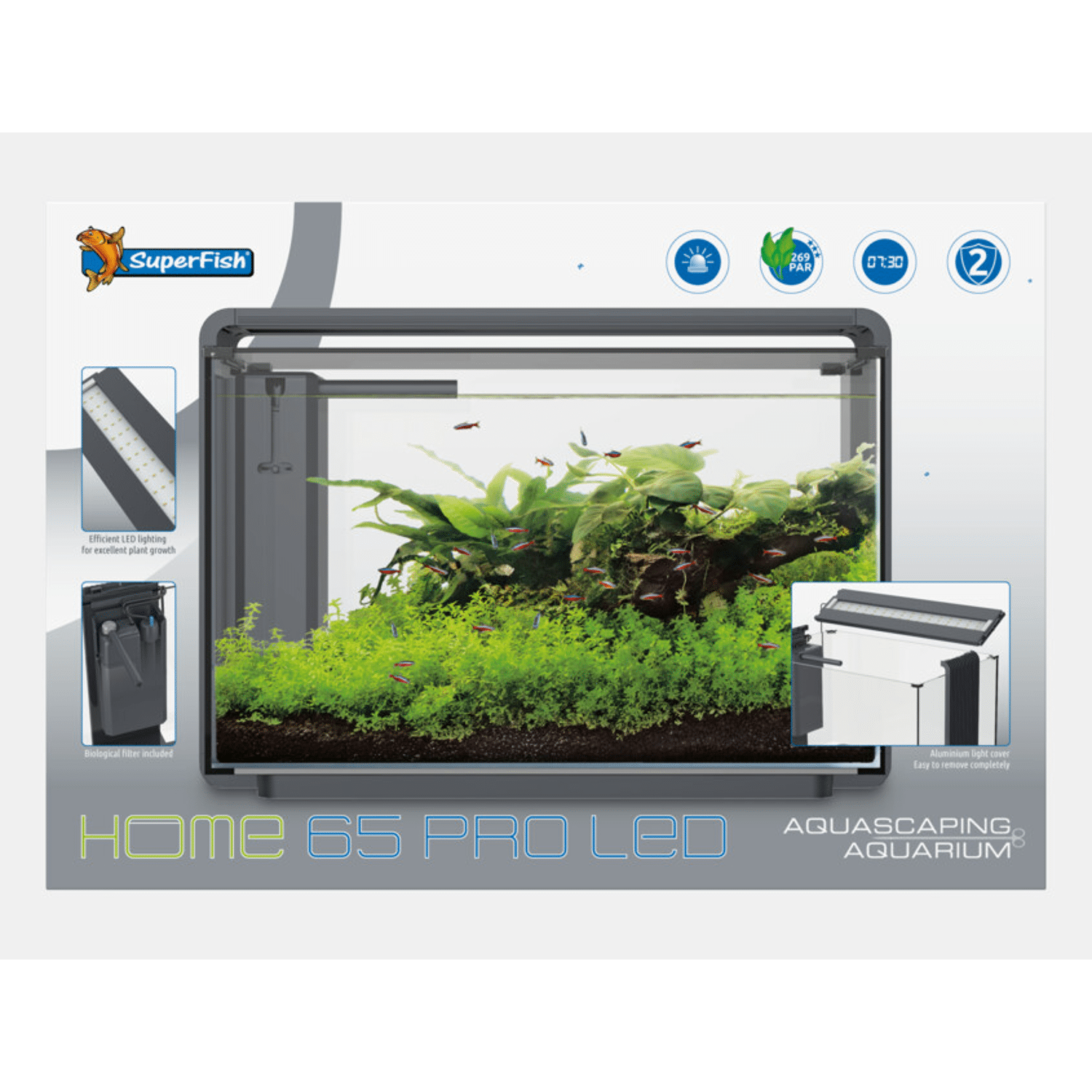 De Home PROLED design aquariums zijn een blikvanger in elke ruimte, van woonkamer of keuken tot in het kantoor. Deze plug-and-play aquaria zijn gemakkelijk te installeren en te onderhouden. De Home PROLED aquaria worden compleet geleverd met innovatieve LED-verlichting, een geïntegreerd binnenfilter met een eenvoudig verwisselbare filtercartridge en een glazen afdekplaat welke voorkomt dat vissen uit het aquarium kunnen springen. De Home PRO LED-verlichting is ontwikkeld voor optimale plantengroei & aquascaping en heeft een PAR-waarde van 269; PAR is het deel van het licht dat planten gebruiken voor fotosynthese, hoe hoger de PAR, hoe beter de plant groeit. Eenvoudig onderhoud door de volledig verwijderbare LED bak en het ingebouwde Aqua-Flow filter, het filterhuis heeft ruimte de installatie van een optionele verwarming. De Home Pro Led verlichting kan worden bediend met een optionele Superfish LED CONTROLLER (A4020200) voor schakelen en dimmen. Inhoud 60 liter, geschikt voor koudwater en tropische vissen, dankzij de geïntegreerde ruimte voor optionele verwarmer. verkrijgbaar in de kleuren wit en zwart, vervangcartridges zijn verkrijgbaar bij uw dealer.