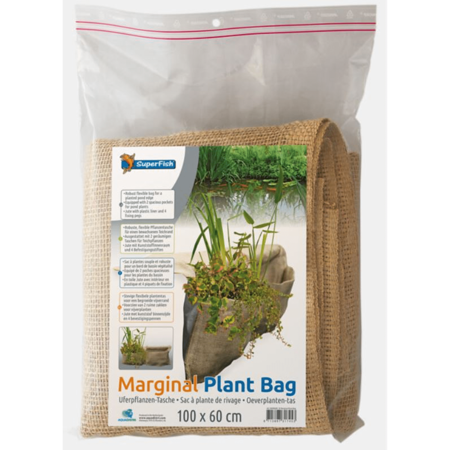 Stevige flexibele plantentas voor een begroeide vijverrand De oeverplanten-tas is voorzien van 2 ruime zakken voor vijverrand. De oeverplanten-tas is gemaakt van jute met een kunststof binnenzijde en wordt geleverd met 4 bevestigingspennen. Deze oeverplanten-tas is gemaakt van jute met een kunststof binnenzijde en wordt geleverd met 4 bevestigingspennen. Afmeting 100X60CM.