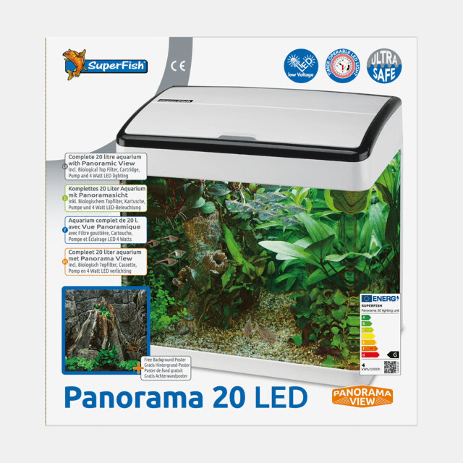 Modern aquarium gemaakt uit gebogen glas wat zorgt voor een schitterend panoramisch effect. Het aquarium wordt geleverd met energiezuinige LED verlichting, pomp, biologisch filter met een grove en een fijne filtermat en een aquariumachterwand. Panoramisch aquarium met veilige waterdichte (IPX8) LED-verlichting, filter en gratis aquarium-achtergrondposter Het handige topfilter met grote biologische filtercapaciteit is gemakkelijk schoon te houden, de vervangbare CrystalClear media cartridge zorgt voor schoon en helder water. Inhoud 17 liter, leverbaar in de kleur wit of zwart, geschikt voor koudwater en tropische vissen. Vervang maandelijks de filtermedia, vervangcartridges zijn verkrijgbaar bij uw dealer.