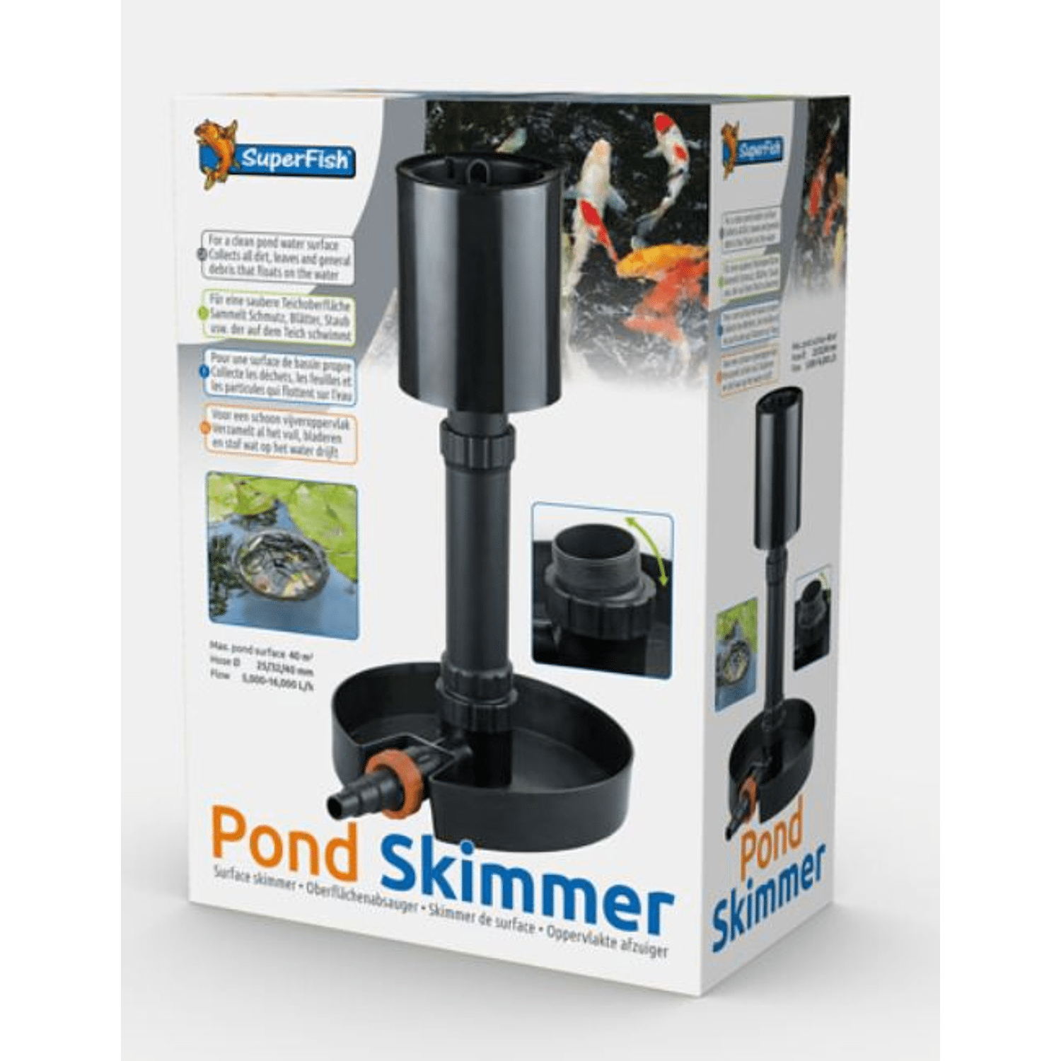 Voor een schoon vijveroppervlak. Verzamelt al het vuil, bladeren en stof wat op het water drijft. Krachtige skimmerreiniging van vijveroppervlakken tot 40 m2 Eenvoudig in onderhoud, de verwijderbare opvangkorf heeft een oog waaraan deze gemakkelijk uit het water getild kan worden De sokkel is kantelbaar (7,5°), waardoor het makkelijker is om de skimmer waterpas te plaatsen op een aflopende vijverbodem De sokkel met opstaande rand kan eenvoudig met stenen verzwaard worden Verstelbare hoogte van 32-59 cm/55-83 cm Zwenkbare Multi-Step slangaansluiting (25-32-40 mm) Vijverpomp en vijverslang vereist, minimale pomp flow 8.000 L/h (20m2), maximale pomp flow 16.000 L/h (40m2) Eenvoudig in onderhoud, de verwijderbare opvangkorf heeft een oog waaraan deze gemakkelijk uit het water getild kan worden. Krachtige skimmerreiniging van vijveroppervlakken tot 40 m2. Vijverpomp en vijverslang vereist, minimale pompcapaciteit 5.000 L/h (20 m2), maximale pompcapaciteit 16.000 L/h (40 m2).