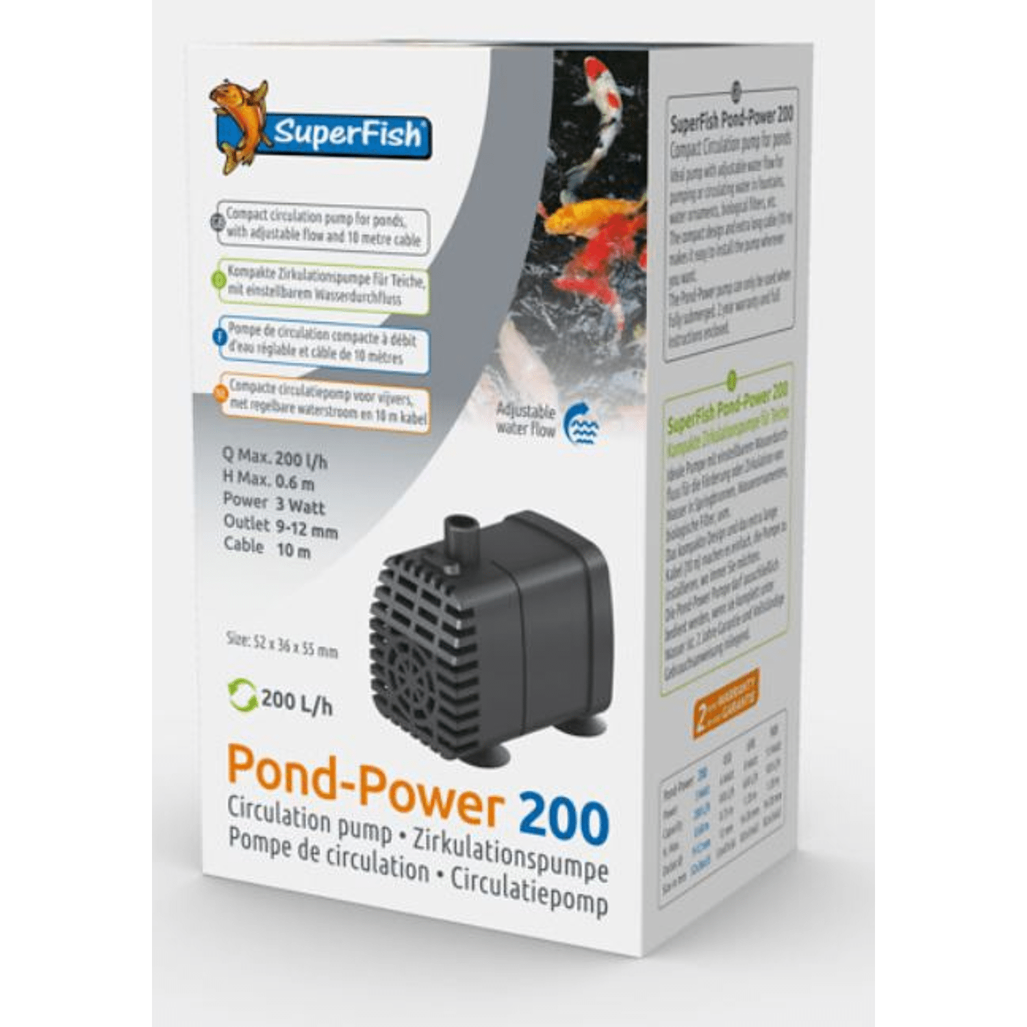 SuperFish Pond-Power circulatiepompen zijn ideaal voor het opvoeren of circuleren van water in fonteinen, waterornamenten, biologische filters, etc. Verkrijgbaar in 4 uitvoeringen, met een pompcapaciteit van resp. 200, 420 of 700 L/h. Compact ontwerp, waardoor de pomp eenvoudig overal te installeren is. Gemaakt om volledig ondergedompeld te worden gebruikt. Voorzien van een extra lange kabel (10 meter). 2 jaar garantie en een uitgebreide gebruiksaanwijzing. Compact ontwerp, waardoor de pomp eenvoudig overal te installeren is, kan alleen volledig ondergedompeld worden gebruikt. Verkrijgbaar in 4 uitvoeringen, met een pompcapaciteit van resp. 200, 450, 650 of 920 L/h. Pompcapaciteit 200 L/h, opvoerhoogte 0,6m, verbruik 3W, voorzien van handige lange buitenkabel van 10 meter voor handig gebruik ook als het stopcontact wat verder weg is, 2 jaar garantie.