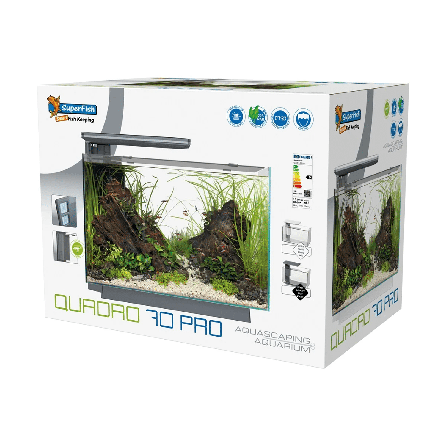 De Superfish Quadro 70 is een modern aquarium, ontworpen voor gebruiksgemak en ideaal voor mensen die op zoek zijn naar een mooi aquarium, maar weinig tijd willen besteden aan het onderhoud. Het geintegreerde filtersysteem houdt het aquariumwater schoon en is voorzien van ruimte voor de aquariumverwarmer die daarmee veilig en uit het zicht kan worden gemonteerd. Design aquarium met een veilige LED-verlichting met 2 kleuren licht, wit en blauw. Het Biologische filter met Crystal Clear cartridge zorgt voor schoon en gezond water, is eenvoudig in gebruik en zorgt dat het water minder vaak ververst hoeft te worden. Het aquarium is ook veilig voor kleine vissen door het fijne rooster op het filter. Inhoud 67 liter, geschikt voor koudwater en tropische vissen, dankzij de geïntegreerde ruimte voor optionele verwarmer. verkrijgbaar in de kleuren wit en zwart, vervangcartridges zijn verkrijgbaar bij uw dealer.