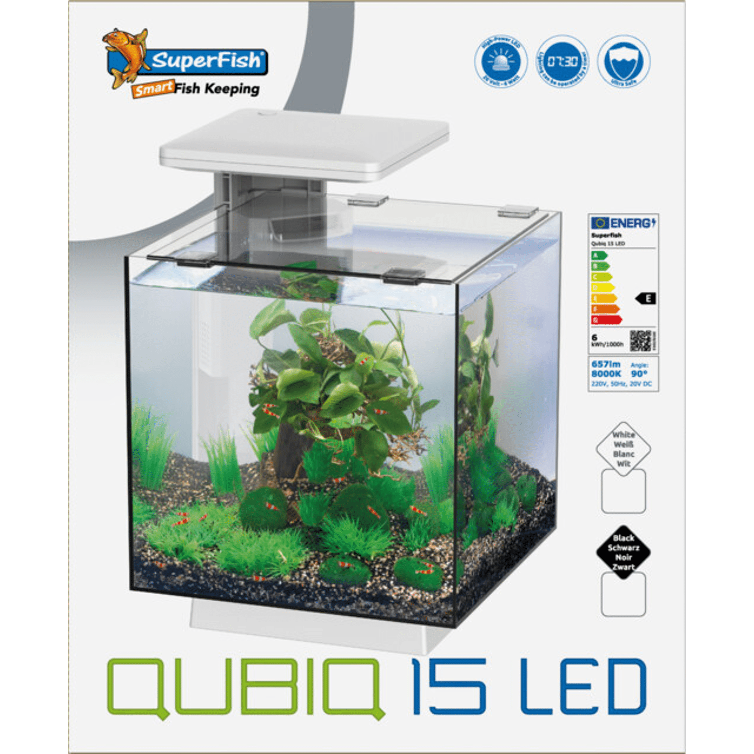 De Superfish QubiQ 15 is ontworpen voor gebruiksgemak en ideaal voor mensen die op zoek zijn naar een mooi aquarium, maar weinig tijd willen besteden aan het onderhoud. Het moderne filtersysteem houdt het aquariumwater schoon en is voorzien van ruimte voor de aquariumverwarmer die daarmee veilig en uit het zicht kan worden gemonteerd. Design aquarium voorzien van energiezuinige LED-verlichting en geïntegreerde ruimte voor optionele verwarmer. De verlichting heeft een sunrise functie, en 2 kleuren, wit en blauw dimbare verlichting. Het Biologische filter met Crystal Clear cartridge zorgt voor schoon en gezond water, is eenvoudig in gebruik en zorgt dat het water minder vaak ververst hoeft te worden. Het aquarium is ook veilig voor kleine vissen door het fijne rooster op het filter. Inhoud 15 liter, geschikt voor kleine vissen, verkrijgbaar in de kleuren wit en zwart, vervangcartridges zijn verkrijgbaar bij uw dealer.