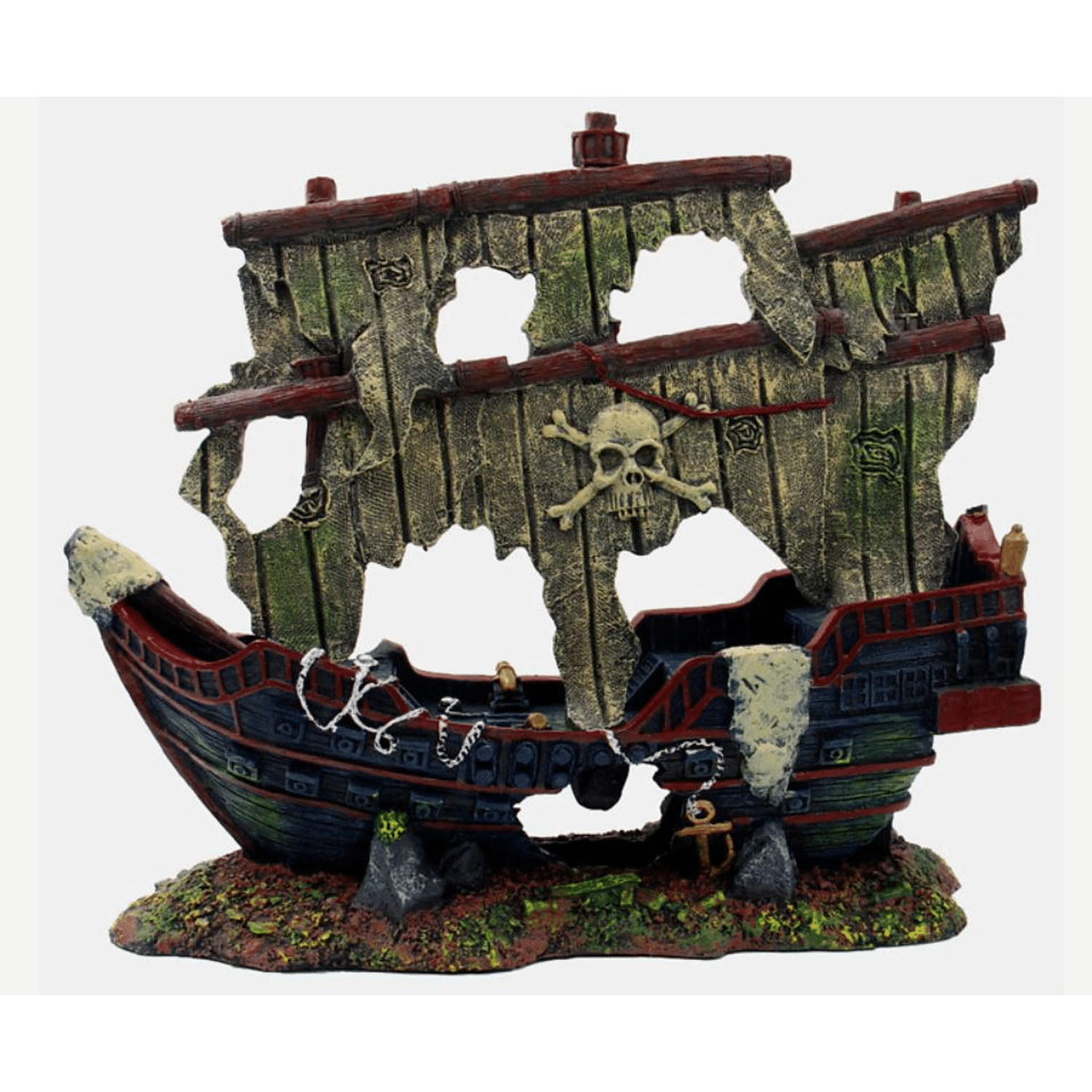 Aquariumdecoratie in de vorm van piraten scheepswrakken, handgeschilderd. Veilig voor uw vissen en het aquarium ecosysteem. Voor het plaatsen in het aquarium eerst grondig afspoelen met kraanwater. Geschikt voor zoetwateraquaria, Nooit reinigen met chemicaliën, dit is schadelijk voor uw vissen, alleen schoonmaken met vers kraanwater. Afmeting 35x14x31 cm