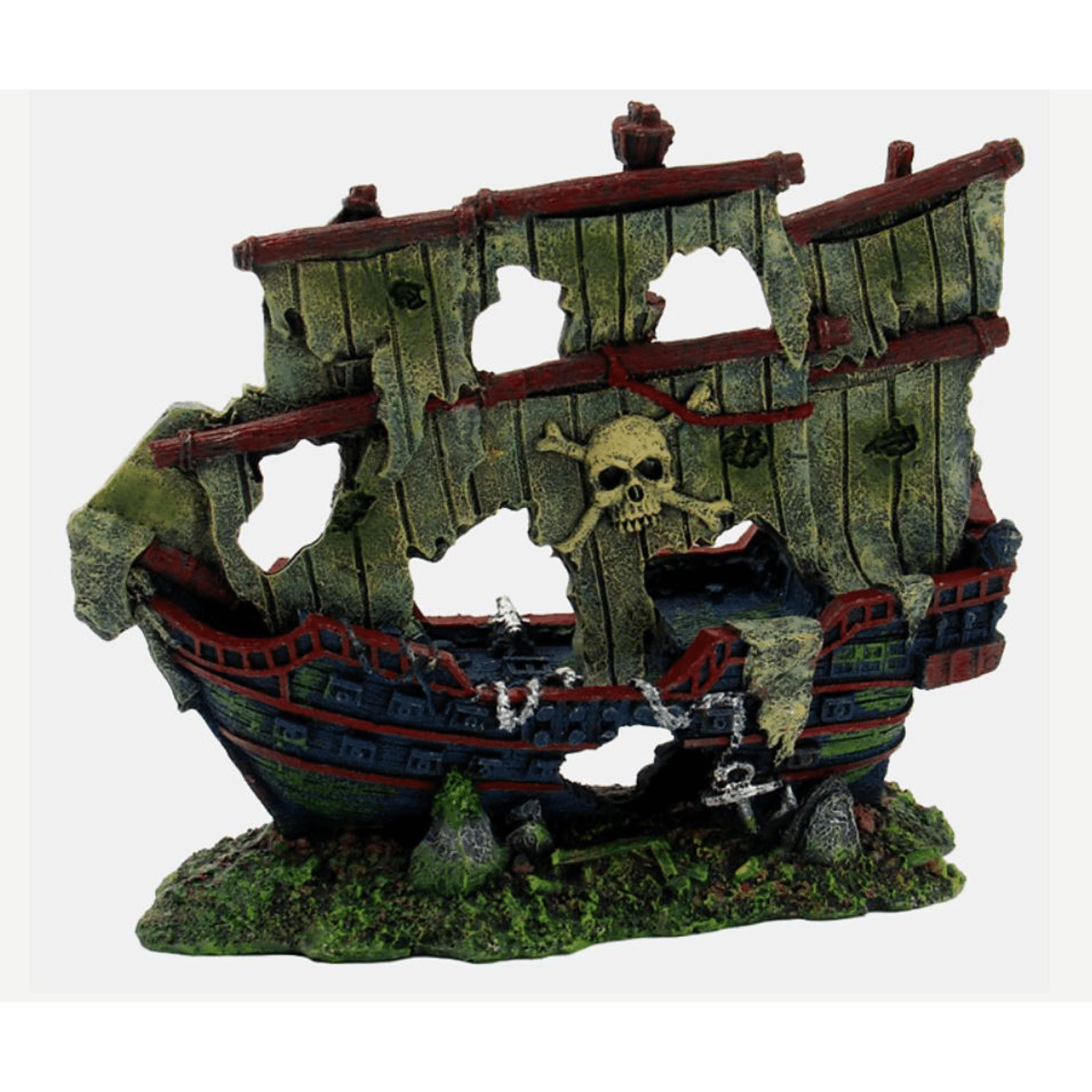 Aquariumdecoratie in de vorm van piraten scheepswrakken, handgeschilderd. Veilig voor uw vissen en het aquarium ecosysteem. Voor het plaatsen in het aquarium eerst grondig afspoelen met kraanwater. Geschikt voor zoetwateraquaria, Nooit reinigen met chemicaliën, dit is schadelijk voor uw vissen, alleen schoonmaken met vers kraanwater. Afmeting 20x8x17 cm