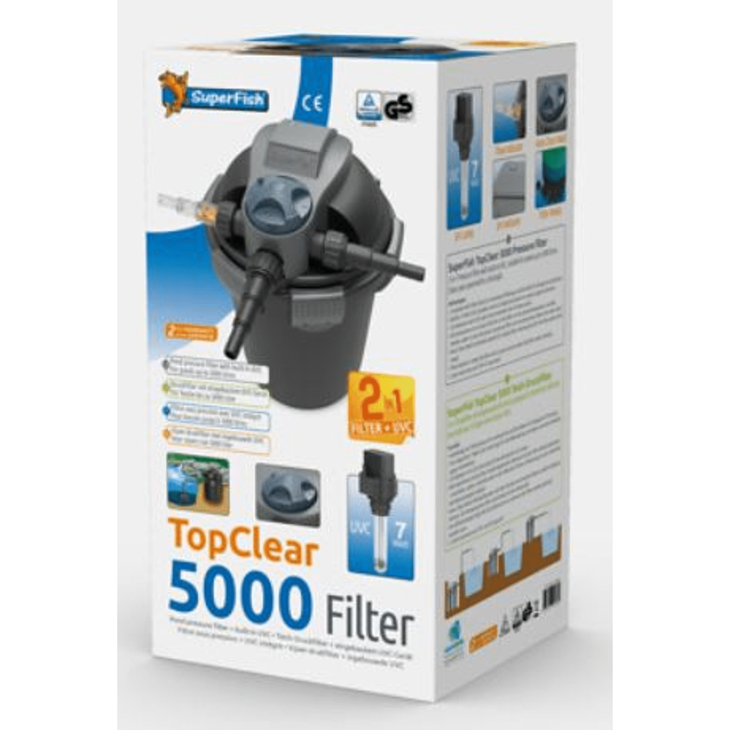 Een uniek 3-staps vijver-drukfilter. 1. Filterschuim zorgt voor mechanische filtering. 2. Bacteriën in de Bio-Balls zorgen voor biologische zuivering. 3. Ingebouwde UVC zorgt voor bestrijding van algen en werkt preventief tegen ziektes. Ingebouwde UVC, zorgt ervoor dat uw vijver binnen 14 dagen glashelder is. Auto Clean Wash, voor het eenvoudig reinigen van uw filter. Door de UV-indicator in de kap kunt u eenvoudig zien of de UV-lamp brandt. De Flow-indicator geeft de doorstroomsnelheid weer, hierdoor ziet u wanneer het filter moet worden gereinigd. Handige montage, omdat alle aansluitingen op de deksel zitten kan het filter bijna geheel worden ingegraven of weggewerkt naast de vijver, zelfs plaatsing onder het waterniveau is mogelijk. Unieke eigenschappen, de UV-indicator in de kap zorgt ervoor dat u kunt zien of de UV-lamp brandt, de Flow-indicator geeft de doorstroomsnelheid weer, hierdoor ziet u wanneer het filter moet worden gereinigd en de Auto Clean Wash zorgt voor eenvoudig reinigen van het filter. Geschikt voor vijvers tot 5.000 liter inhoud, inclusief 7W UVC, energiezuinig, voordelig in gebruik, geleverd met 5 meter kabel en 2 jaar garantie.