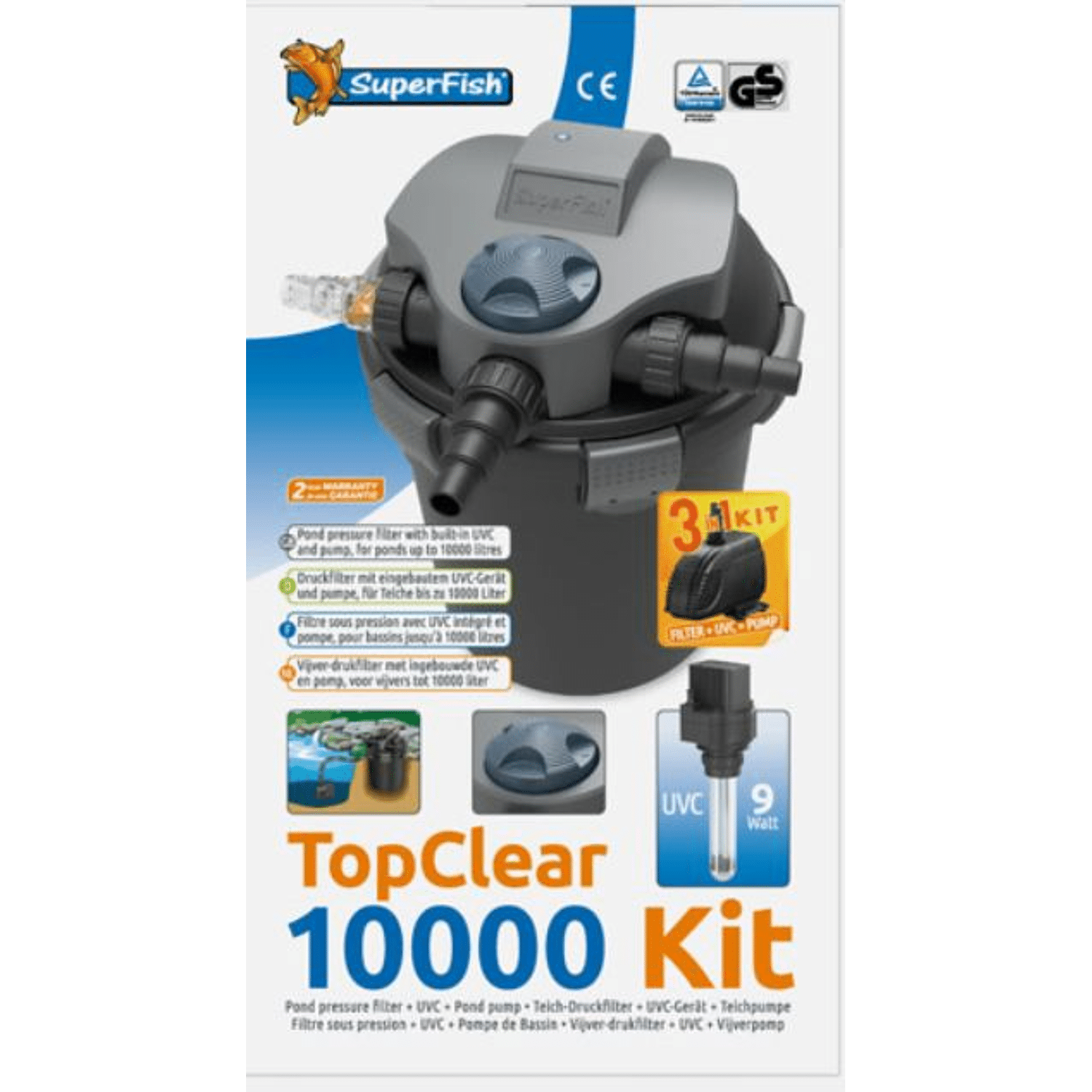 De TopClear 5000 en 10000 zijn ook verkrijgbaar als complete 3-in-1 kit met pomp.De TopClear 5000 Kit is voorzien van de Pond-Flow ECO 2000 pomp, met een pompcapaciteit van 2.000 liter per uur bij 25 Watt. De TopClear 10000 Kit is uitgerust met een 45 Watt Pond-Flow ECO 3000 pomp, met een capaciteit van 2.900 liter per uur. Handig 3-staps vijver-drukfilter geleverd compleet met vijverpomp. Handige montage, omdat alle aansluitingen op de deksel zitten kan het filter bijna geheel worden ingegraven of weggewerkt naast de vijver, zelfs plaatsing onder het waterniveau is mogelijk. Unieke eigenschappen, de UV-indicator in de kap zorgt ervoor dat u kunt zien of de UV-lamp brandt, de Flow-indicator geeft de doorstroomsnelheid weer, hierdoor ziet u wanneer het filter moet worden gereinigd en de Auto Clean Wash zorgt voor eenvoudig reinigen van het filter. Geschikt voor vijvers tot 10.000 liter inhoud, geleverd inclusief Pond-Flow ECO 3000 2.900 L/h pomp (45 Watt) en 9W UVC en 2 jaar garantie.