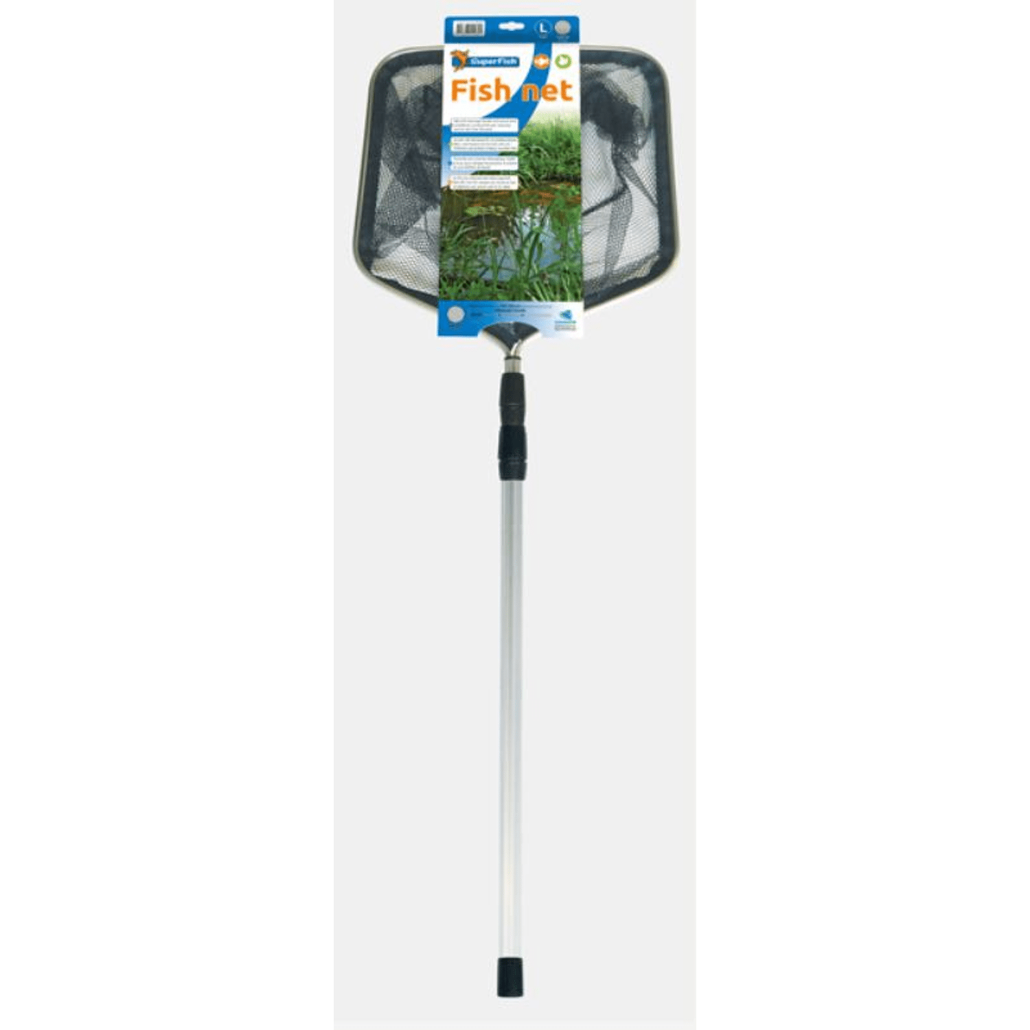 Sterk aluminium vijverschepnet met een telescopische aluminium steel, leverbaar met fijn- en grofmazig net. Zwart grofmazig net. Grofmazige netten zijn geschikt voor het vangen van vissen en grover vuil. Met de fijnmazige netten verwijdert u fijn vuil en algen uit de vijver. Afmeting net 38X35CM, telescopische steel, lengte 12-22CM.