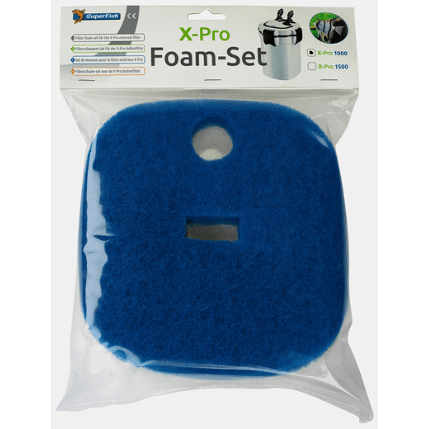 Vervang schuimset voor de Superfish X Pro filters. Verkrijgbaar in vijf verschillende maten voor X Pro 400, 1000, 1500, 2000 en 2000 UV. Vervangschuim voor de X-Pro 1000 Bestaat uit 2 fijne (witte) en 1 grove (blauwe) filtermat 3 vervangsponsen, ons advies is telkens 1 spons te vervangen, zo blijft het bacterieleven in de overige sponzen in stand.